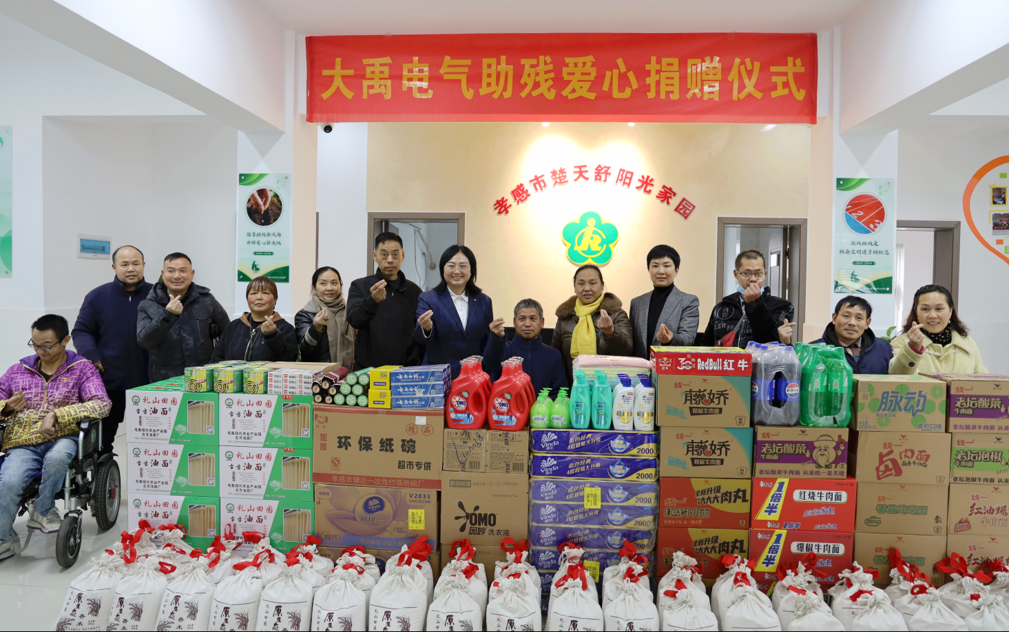 【概要描述】新春伊始,為認真貫徹2025年全省殘聯(lián)工作會議精神,持續(xù)擦亮“愛鑄荊楚”品牌,孝感市殘聯(lián)積極整合社會資源,大力實施“楚天舒陽光家園”服務升級行動。2月21日,孝感市愛心助殘就業(yè)創(chuàng)業(yè)企業(yè)聯(lián)盟主席單位——大禹電氣科技股份有限公司向孝感市“楚天舒陽光家園”捐贈價值3萬元的生活物資,推動陽光家園服務提檔升級。孝感市殘聯(lián)黨組書記、理事長朱麗玲,大禹電氣公司總經(jīng)理王琴等共同出席了捐贈儀式。20余名城區(qū)困難殘疾人現(xiàn)場領取了部分物資。