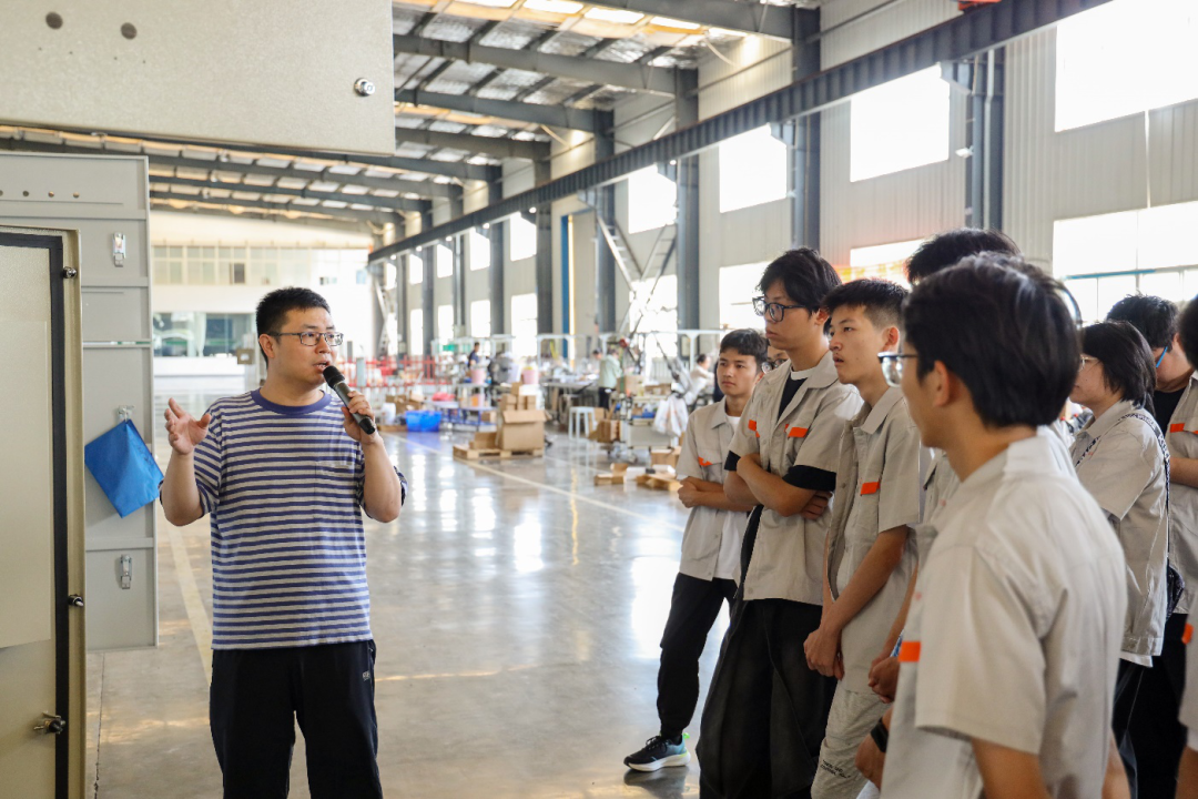 在工作人員的引導(dǎo)下,師生們有序參觀了公司的核心生產(chǎn)區(qū)域。電氣工程師李飛以通俗易懂的講解和生動(dòng)的演示,為同學(xué)們?cè)敿?xì)介紹了變頻器類、軟起動(dòng)類、電氣工程成套類以及電源測(cè)試負(fù)載類等相關(guān)產(chǎn)品的工作原理及應(yīng)用場(chǎng)景。激發(fā)了同學(xué)們濃厚的興趣和探索欲。在這些承載著公司核心競(jìng)爭(zhēng)力的區(qū)域,讓同學(xué)們對(duì)電氣產(chǎn)品的生產(chǎn)制造有了更切身的體會(huì)。
